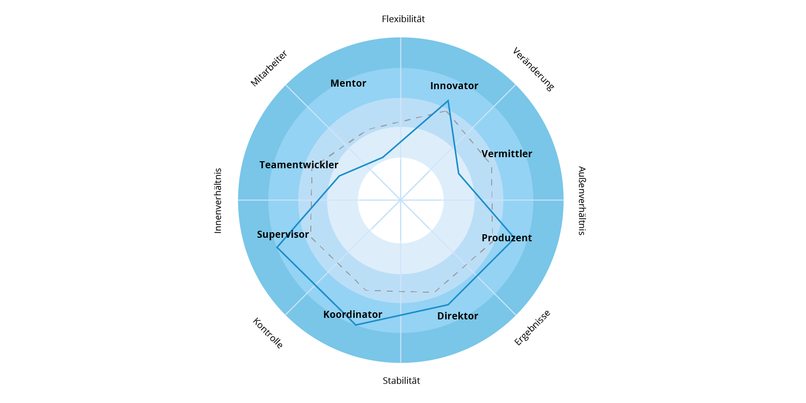So kann die Auswertung bei einem Persönlichkeitstest für Führungskräfte aussehen. Die gestrichelte und die blaue Linie zeigen zwei unterschiedliche Merkmalsausprägungen.
