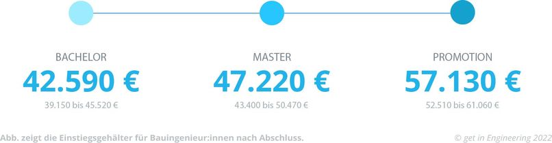 Die meisten Student:innen im Ingenieurwesen hängen nach ihrem Bachelor-Abschluss noch ein paar Semester dran, um im Master ihr Fachwissen zu vertiefen oder während der Promotion z.B. an innovativen Baustoffen zu forschen und anschließend mit einem Doktortitel durchzustarten. Diese zusätzliche Zeit an der Hochschule wirkt sich neben Deinem theoretischen Wissensstand auch auf Dein Gehalt aus. Als Bauingenieur:in liegt Dein Gehalt bei einem Direkteinstieg mit einem Bachelor-Abschluss bei 43.400 €, als Master-Absolventen verdienst Du 48.100 € und wenn Du Dich für die Promotion entscheidest, liegt Dein Gehalt bereits beim Berufseinstieg bei 58.200 €.