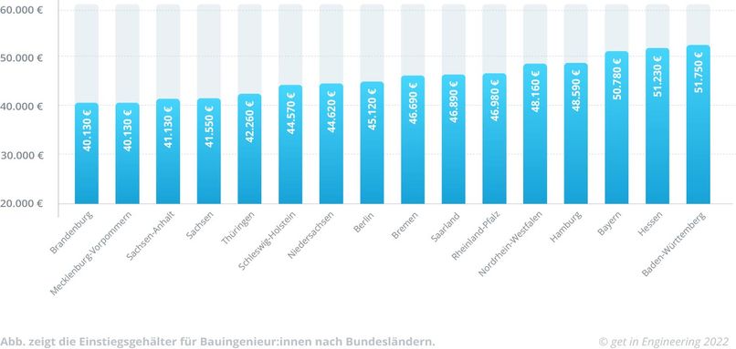 Bei Deinem Berufseinstieg kannst Du – je nach Region, in der Du Deinen neuen Job antrittst – zwischen 41.300 und 54.800 € verdienen. Damit hat die Region, in der Du arbeitest, nach Deinem Abschluss den zweitgrößten Einfluss auf Dein Bauingenieur:innen-Einstiegsgehalt. Am meisten Geld bekommst Du in Baden-Württemberg, Bayern und Hamburg während Du in Brandenburg, Sachsen, Mecklenburg-Vorpommern, Schleswig-Holstein und Sachsen-Anhalt weniger für die gleiche Arbeit verdienst - zwischen 41.300 und 45.700 €.