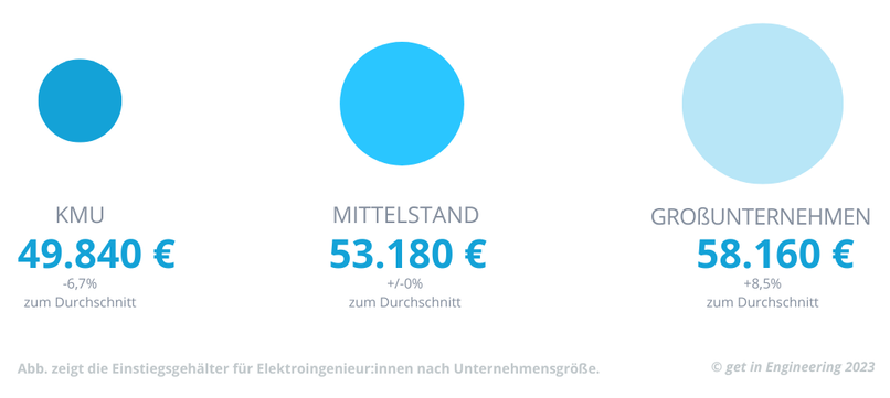 Hier gibt es eine Faustregel: Je größer Dein Arbeitgeber ist, desto höher fällt in der Regel auch Dein Gehalt aus. Wenn Du als Elektroingenieur:in arbeitest, kann der Gehaltsunterschied zwischen einem kleinen Unternehmen und einem global Player schon am Anfang Deiner Karriere bei rund 17.000 € liegen. In einem KMU mit bis zu 250 Mitarbeitenden verdienst Du 51.500 €, im Mittelstand mit bis zu 1.000 Angestellten sind es rund 54.800 € und in einem Großunternehmen kannst Du sogar mit 58.100 € rechnen.