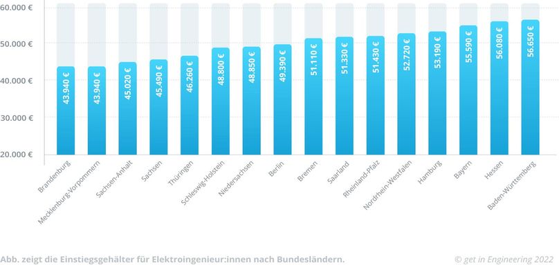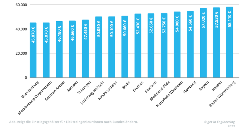Das Bundesland, in dem Du arbeitest, hat bei Elektroingenieur:innen wie Dir den größten Einfluss auf das Gehalt. Bei Deinem Berufseinstieg kannst Du – je nach Region, in der Du Deinen neuen Job antrittst – zwischen 47.100 und 62.500 € verdienen. Am meisten Geld bekommst Du in Baden-Württemberg, Hamburg und Bayern während Du in Sachsen-Anhlt und Sachsen ca. 13.000 € weniger für die gleiche Arbeit verdienst.