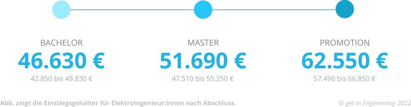 Je länger Du an Deiner Hochschule studierst, desto mehr Fachwissen bringst Du natürlich auch mit ins Unternehmen. Die meisten Studierenden im Ingenieurwesen hängen deshalb nach ihrem Bachelor-Abschluss noch ein paar Jahre Uni dran, um den Master zu machen oder ihr Studium nach der Promotion mit einem Doktortitel zu beenden. Diese zusätzliche Zeit an der Hochschule wirkt sich neben Deinem theoretischen Wissensstand auch auf Dein Gehalt aus. Als Elektroingenieur:in liegt Dein Gehalt bei einem Direkteinstieg mit einem Bachelor-Abschluss bei 49.400 €, als Master-Absolvent:in verdienst Du 54.800 € und wenn Du Dich für die Promotion entscheidest, kannst Du mit durchschnittlich 66.300 € pro Jahr rechnen.