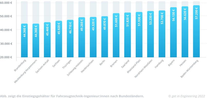 Bei Deinem Berufseinstieg kannst – je nach Region, in der Du Deinen neuen Job antrittst – zwischen 46.700 und 61.900 € verdienen. Damit hat die Region, in der Du arbeitest, den zweitgrößten Einfluss auf Dein Einstiegsgehalt als Ingenieur:in für Fahrzeugtechnik. Am meisten Geld bekommst Du in Bayern, Hamburg und Baden-Württemberg.
