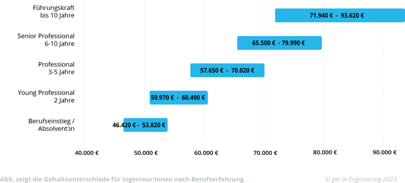 Wenn Du mit den Jahren immer mehr Berufserfahrung aufbaust und Deine Learnings erfolgreich im Job umsetzen kannst, dann steigst Du die Karriereleiter hinauf – und entsprechend höher fällt mit den Jahren auch Dein Gehalt aus. Die Gehaltsspanne wird allerdings von Karrierestufe zu Karrierestufe immer breiter, weil Faktoren wie etwa Deine Personalverantwortung und auch Dein Verhandlungsgeschick eine entscheidende Rolle spielen. Wenn Du entsprechende Karriereentscheidungen triffst, sind sechstellige Gehälter nach einigen Jahren für Dich als Ingenieur:in mit Berufserfahrung und in verantwortungsvollen Positionen defintiv drin.