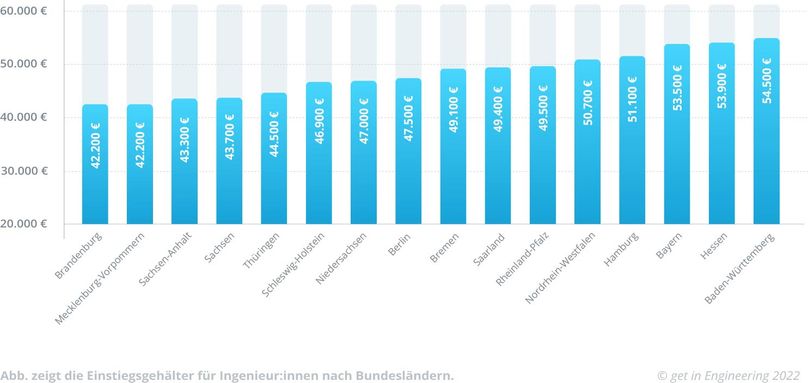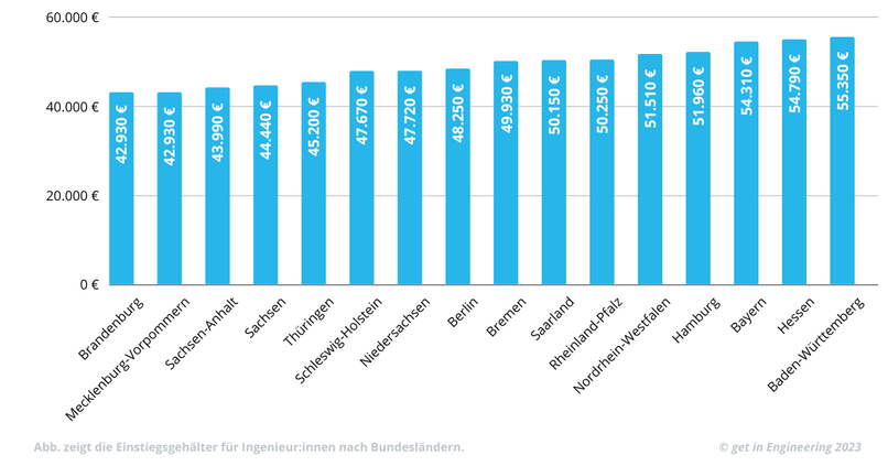 Spätestens nach dem Studium steht für Dich eine wichtige Entscheidung an: Möchtest Du in Deiner Region bleiben und möglichst heimatnah einen Arbeitgeber finden, zieht es Dich in eine andere Stadt oder sogar ein anderes Bundesland? Wenn Du prinzipiell offen für einen Umzug bist, kann sich das für Dich durchaus lohnen. Während Du in den sogenannten neuen Bundesländern mit hoher Wahrscheinlichkeit mit einem Gehalt von um die 50.000 € (häufig auch darunter) einsteigst, kannst Du in Baden-Württemberg bei Deinem Einstieg schon über 60.000 € verdienen. Aber auch in Hamburg und Bayern sehen Deine Gehaltsaussichten überdurchschnittlich gut aus, weil hier traditionell viele Arbeitgeber mit industriellem Schwerpunkt ihren Sitz haben.
