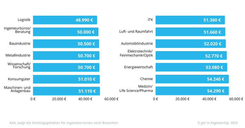 Als Ingenieur:in hast Du den Vorteil, dass Du in fast jeder Branche einsteigen kannst: von der Automobilindustrie über die Logistik bis hin zur Luft- und Raumfahrttechnik. Genau so unterschiedlich wie die einzelnen Branchen ist aber auch das Gehalt, das Du verdienen kannst. Wenn Du am Ende besonders viel Geld in der Tasche haben willst, sind aktuell die IKT-Branche, der Bereich Maschinen- und Anlagenbau, die Medizin- und Pharmaindustrie und die Luft- und Raumfahrtbranche die Branchenführer. Im Gegensatz dazu fällt Dein Gehalt im öffentlichen Dienst, im Bauwesen und der Logistik am geringsten aus. Mit diesem Gehalt kannst Du in den einzelnen Branchen rechnen: