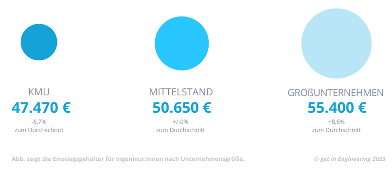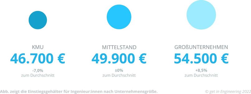 Bei der Unternehmensgröße gibt es eine einfache Faustformel: Je größer das Unternehmen ist, desto höher fällt in der Regel auch Dein Gehalt aus – und das über alle Branchen, Bundesländer und Berufsfelder hinweg. Dementsprechend verdienst Du bei Deinem Berufseinstieg in einem KMU etwas weniger als die durchschnittliche Berufseinsteiger:in im Ingenieurwesen – trägst dafür aber von Anfang an mehr Verantwortung und kannst Deine Ideen durch die flacheren Hierarchien leichter umsetzen. Wenn Du nach dem Studium direkt den Sprung in einen großen Konzern schaffst, kannst Du mit einem Gehalt von 56.400 € rechnen – und damit mehr verdienen als der Durchschnitt aller Absolvent:innen im Ingenieurwesen.