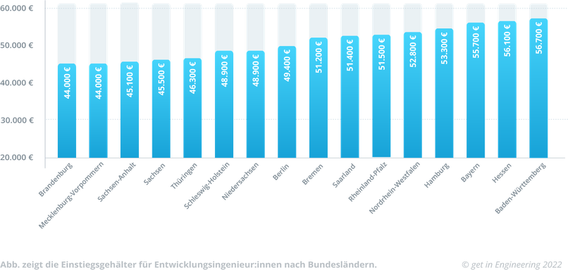Bei den Bundesländern sind die Gehaltsunterschiede für Entwicklungsingenieur:innen riesig und können darüber entscheiden, ob Du am Ende des Jahres knapp 17.000 € mehr oder weniger in der Tasche hast. Bei Deinem Berufseinstieg kannst Du in Baden-Württemberg, Hamburg, Bayern, Bremen und Hessen bereits mit einem Gehalt jenseits der 60.000 € rechnen. In Sachen-Anhalt und Sachsen dagegen verdienst Du im Jahr unter 50.000 €. Die Gehaltsspanne zwischen den einzelnen Bundesländern in der Gesamtbetrachtung liegt zwischen 48.700 € und 64.500 €.