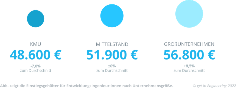Generell kann man sagen: Je größer Dein Arbeitgeber ist, desto höher ist im Normalfall auch Dein Gehalt. Wenn Du als Ingenieur:in in der Entwicklung arbeitest, kann der Gehaltsunterschied zwischen kleinen und großen Firmen schon am Anfang Deiner Karriere bei bis zu 16.000 € liegen. In einem KMU mit bis zu 250 Mitarbeitern verdienst Du 53.200 €, im Mittelstand mit bis zu 1.000 Angestellten sind es 56.600 € und in einem Großunternehmen sogar 60.000 €.