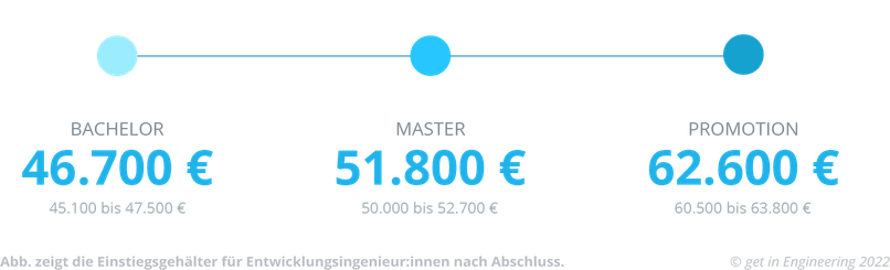 Je länger Du an Deiner Hochschule studierst, desto mehr Fachwissen bringst Du natürlich auch mit in Deinen ersten Job. Die meisten Ingenieur-Student:innen hängen deshalb nach ihrem Bachelor-Abschluss noch ein paar Jahre Uni dran, um den Master zu machen oder sogar zu promovieren. Diese zusätzliche Zeit an der Hochschule wirkt sich neben Deinem theoretischen Wissensstand auch auf Dein Gehalt aus. Als Entwicklungsingenieur:in liegt Dein Gehalt bei einem Direkteinstieg mit einem Bachelor-Abschluss bei 51.100 €, als Master-Absolventen verdienst Du 56.600 € und wenn Du die Uni mit einer Promotion abschließt, ganze 68.500 €.