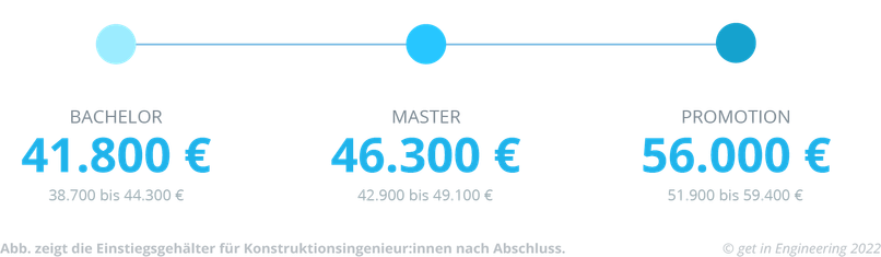 Je höher Dein akademischer Abschluss nach dem Studium ist, desto mehr Fachwissen und Praxiserfahrung hast Du in der Uni, während Praktika oder auch bei Deiner Arbeit als Werkstudent:in gesammelt. Das belohnen die Arbeitgeber in der Regel und Dein Einstiegsgehalt fällt höher aus. Wenn Du nach Deinem Bachelor-Abschluss in der Konstruktion anfängst, liegt Dein Gehalt im Durchschnitt bei 44.300 €, nach dem Master bekommst Du 49.100 € und als promovierte Konstruktionsingenieur:in liegt Dein Einstiegsgehalt bei 59.500 €.