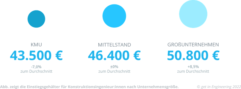 Vor Deinem Berufseinstieg musst Du also für Dich entscheiden, was Dir wichtiger ist: Ein familiäres Miteinander im Büro oder ein höheres Gehalt? Eine richtige oder falsche Antwort gibt es hier nicht und Du kannst in beiden Fällen gut von Deinem Ingenieur:innen-Gehalt leben – auch, wenn die Unternehmensgröße über 6.000 € mehr oder weniger im Portemonnaie entscheidet. Wenn Du in einem KMU einsteigst, kannst Du am Anfang Deiner Karriere mit 46.200 € rechnen, in mittelständischen Unternehmen verdienst Du 49.100 € und wenn Du den Jobeinstieg bei einem Großunternehmen schaffst, kannst Du mit 52.100 € rechnen.