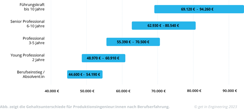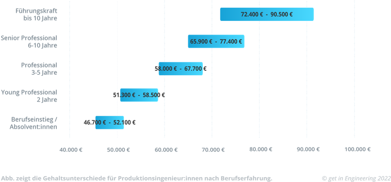 Du solltest allerdings beachten, dass die Gehaltsspanne mit steigender Berufserfahrung auch immer größer wird. Das liegt vor allem daran, dass hier natürlich Faktoren wie Dein Geschick bei der Gehaltsverhandlung mit reinspielen, auf der anderen Seite sind manche Produktionsingenieur:innen nach 8 Jahren vielleicht schon Standortleiter:innen, während andere in ihrer Rolle als Teamlead voll aufgehen. So können sich etwa bei Führungskräften Gehaltsunterschiede von rund 15.000 € ergeben.