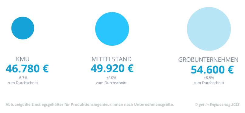 Du musst Dich also vor dem Einstieg in Deinen Job entscheiden: Ist Dir eine familiäre Arbeitsweise lieber oder kannst Du gut mit Druck umgehen und willst mehr Geld verdienen? Eine richtige oder falsche Antwort gibt es hier nicht und Du kannst in beiden Fällen gut von Deinem Ingenieur:innen-Gehalt leben – auch, wenn der Gehaltsunterschied zwischen kleinen und großen Unternehmen mehr als 15.000 € ausmachen kann. Wenn Du in einem KMU einsteigst, liegt Dein Anfangsgehalt bei 53.100 €, wenn Du Dich für ein mittelständisches Unternehmen entscheidest, verdienst Du 56.500 € und wenn Du den Schritt zu einem Großunternehmen schaffst, kannst Du sogar mit 59.800 € rechnen.