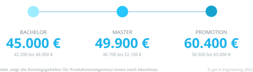 Je höher Dein akademischer Grad nach dem Studium ist, desto mehr Fachwissen hast Du Dir an der Uni, aber auch durch Praktika oder Werkstudierendentätigkeiten, erarbeitet. Dieses Wissen honorieren die Arbeitgeber in der Regel auch und zahlen Produktionsingenieur:innen mit Bachelor-Abschluss ein Gehalt von 50.900 €, Master-Absolventen bekommen 56.500 € und Berufseinsteiger, die promoviert haben, können sogar mit 68.300 € rechnen.