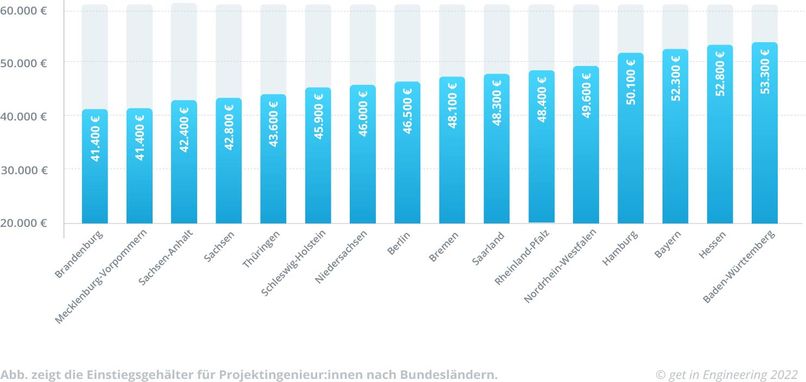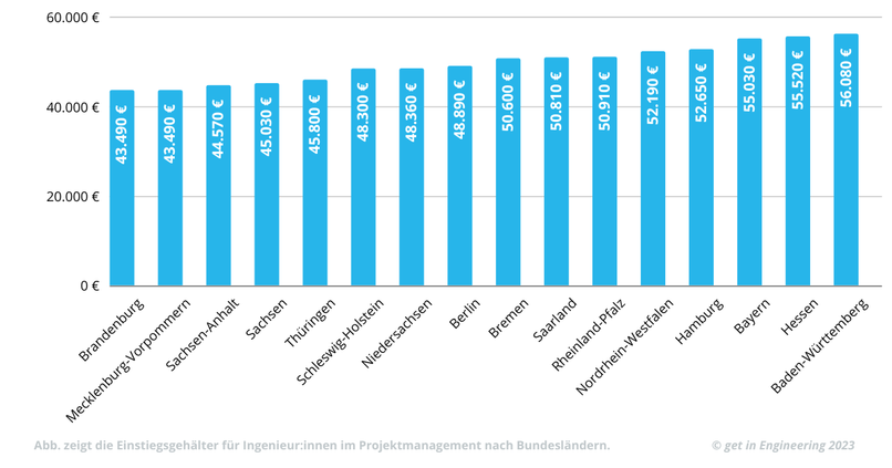 Am niedrigsten fällt Dein Gehalt in Sachsen-Anhalt und Sachsen aus. In diesen Bundesländern steigst Du als Ingenieur:in im Projektmanagement im Schnitt mit unter 48.000 € in Deinen Job ein.