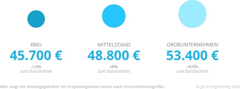 Generell gilt: Je größer Dein Arbeitgeber ist, desto höher fällt im Normalfall auch Dein Gehalt aus. Wenn Du als Projektingenieur:in anfängst, kann der Gehaltsunterschied zwischen kleinen und großen Firmen schon am Anfang Deiner Karriere bei 16.000 € liegen. In einem KMU verdienst Du 51.200 €, im Mittelstand sind es 54.500 € und in einem Großunternehmen 57.800 €.