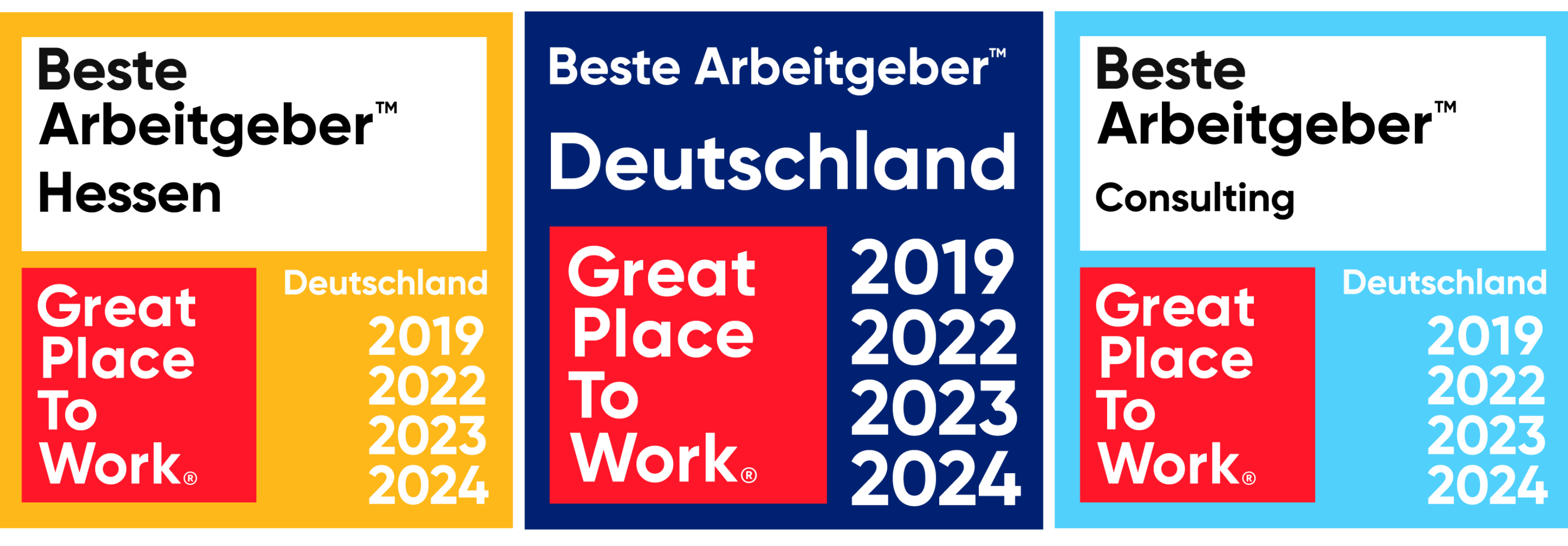Bereits seit 2019 lassen wir uns regelmäßig vom Great Place to Work® Institut zertifizieren. Und das mit Erfolg! Regelmäßig erhalten wir in der Kategorie „Beste Arbeitgeber Deutschlands“ Platzierungen in den Top 10 der 100 besten Arbeitgeber Deutschlands. Seit letztem Jahr auch in der Kategorie Großunternehmen mit mehr als 500 Mitarbeitenden. In den Kategorien „Beste Arbeitgeber der Consulting-Branche“ sowie „Beste Arbeitgeber Hessens“ konnten wir uns bereits mehrfach über einen 1. Platz freuen. Das Great Place to Work® Institut zeichnet Unternehmen aus, die ihren Beschäftigten eine besonders attraktive Unternehmenskultur vorleben und bieten. Themen sind unter anderem Vertrauen in Führungskräfte, Fairness, Teamgeist, Wertschätzung, Respekt sowie Identifikation mit dem Unternehmen.